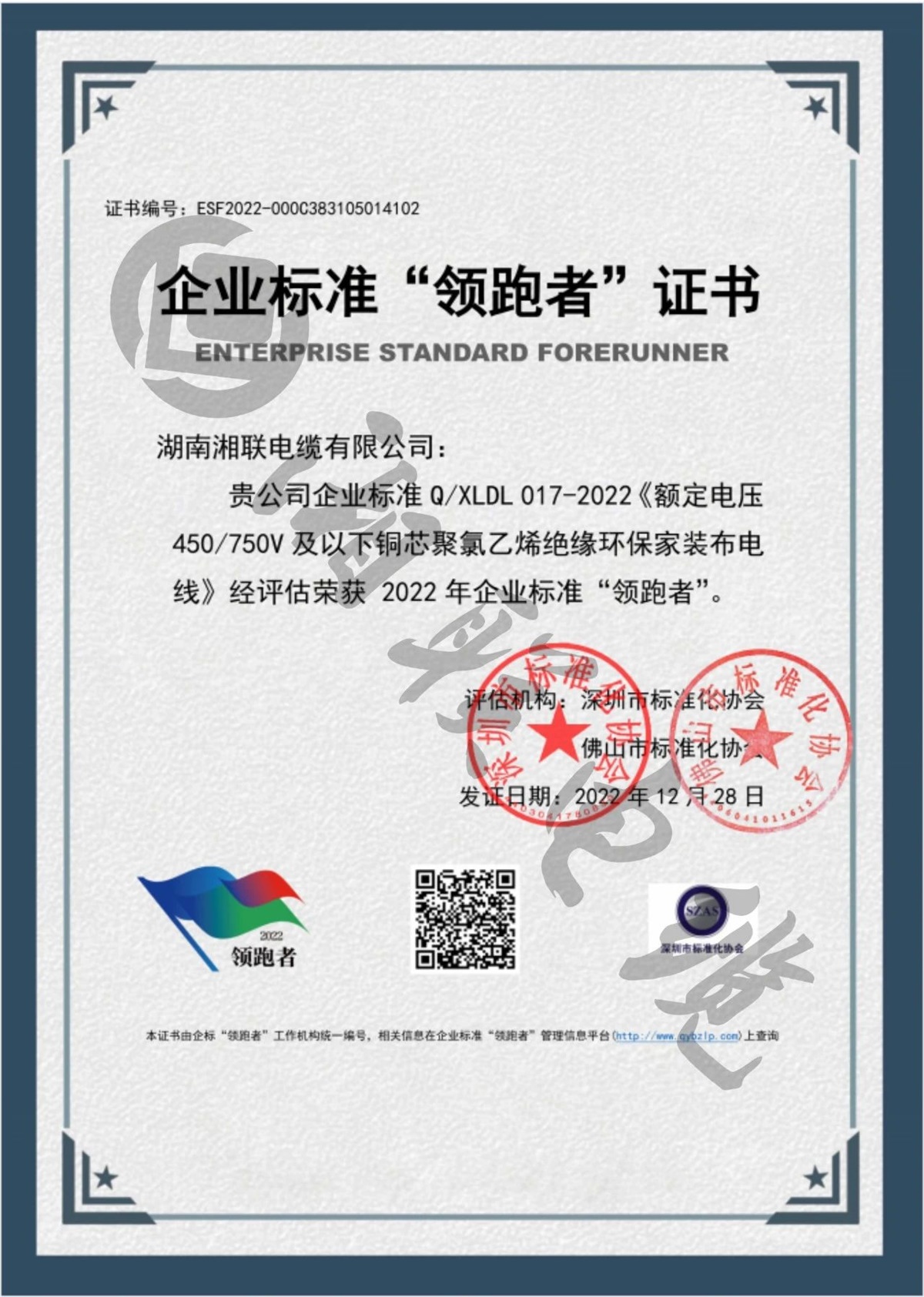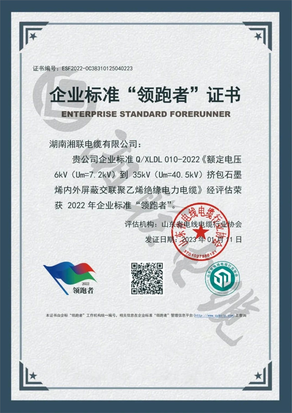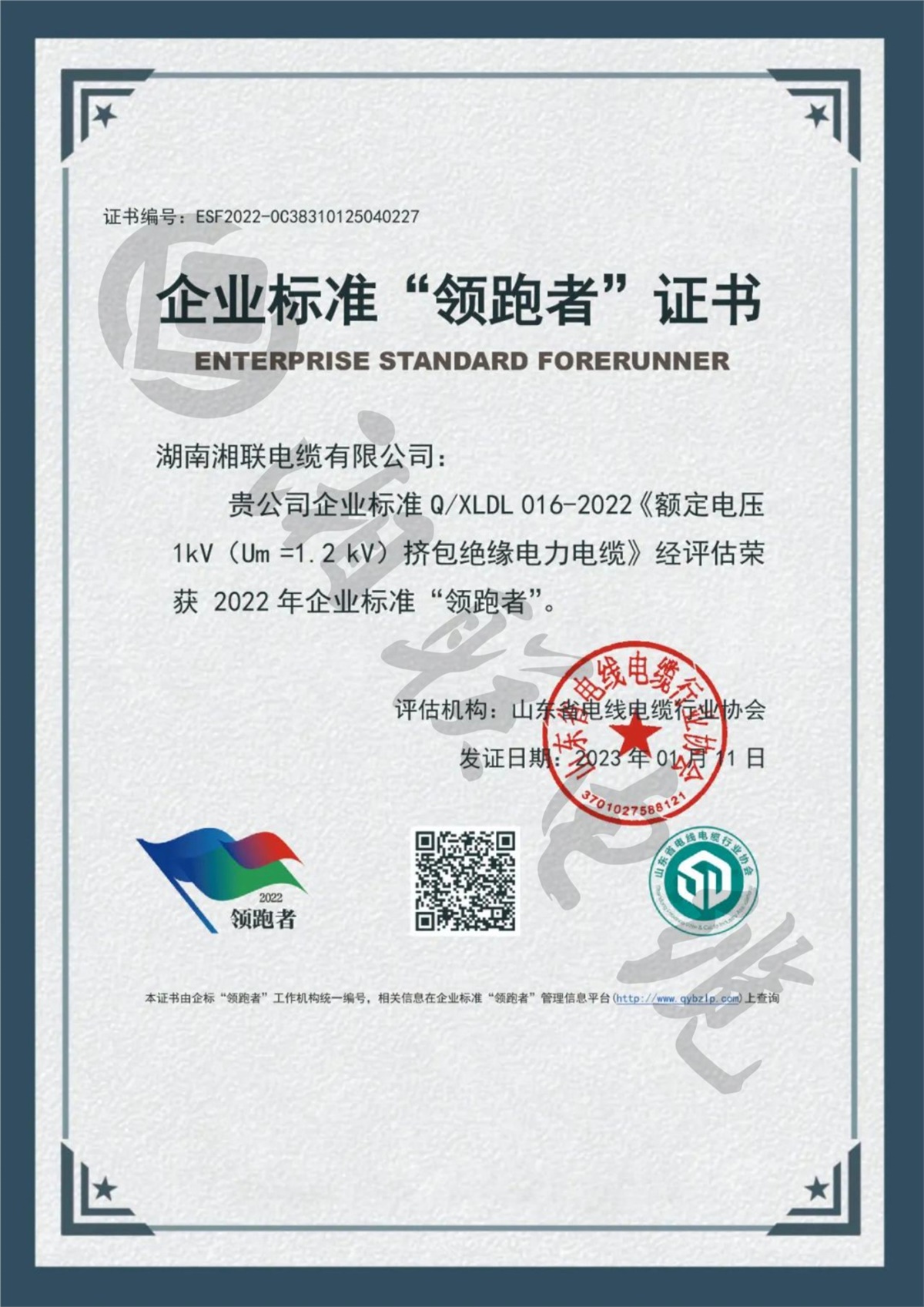1月,湖南湘聯(lián)電纜有限公司三項企業(yè)標(biāo)準(zhǔn)經(jīng)評定,榮獲2022年全國企業(yè)標(biāo)準(zhǔn)“領(lǐng)跑者”。