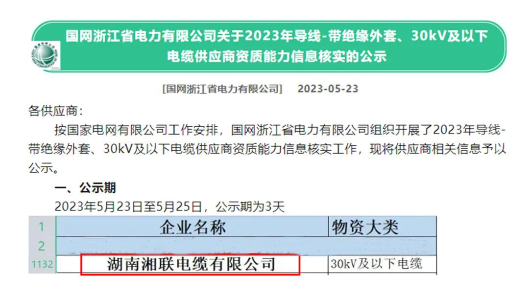 5月,憑借出色的產(chǎn)品品質(zhì)、優(yōu)質(zhì)的服務(wù)和良好的聲譽(yù),湘聯(lián)電纜通過了審查,成為2023年國網(wǎng)供應(yīng)商。