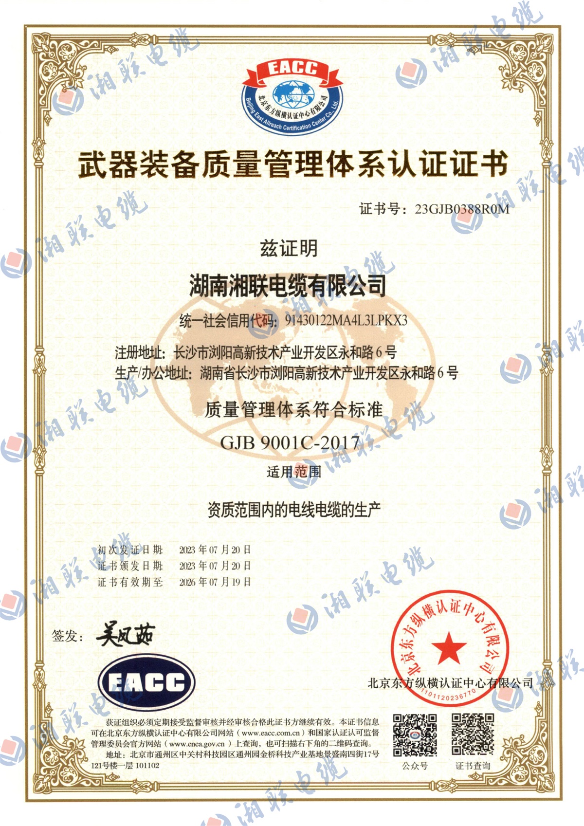 7月,湘聯(lián)電纜順利通過國軍標(biāo)質(zhì)量管理體系認(rèn)證,獲得《武器裝備質(zhì)量管理體系認(rèn)證證書》。