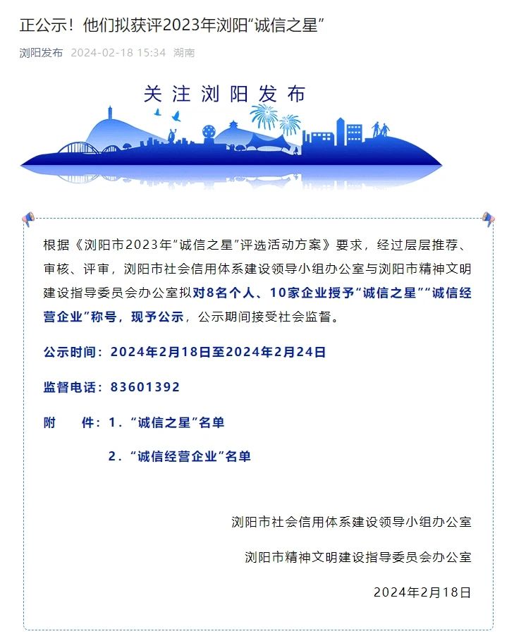 近日,瀏陽市社會信用體系建設(shè)與瀏陽市精神文明建設(shè)指導委員會辦公室聯(lián)合開展的瀏陽市2023年“誠信之星”評選進入公示期,湖南湘聯(lián)電纜有限公司成功入選,成為2023年“誠信之星”。