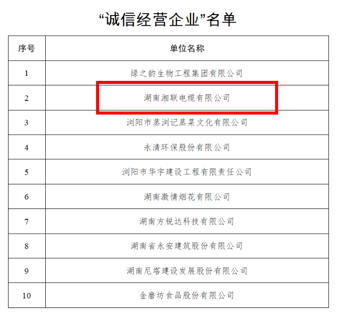 點贊!湘聯(lián)電纜獲評“誠信之星”!