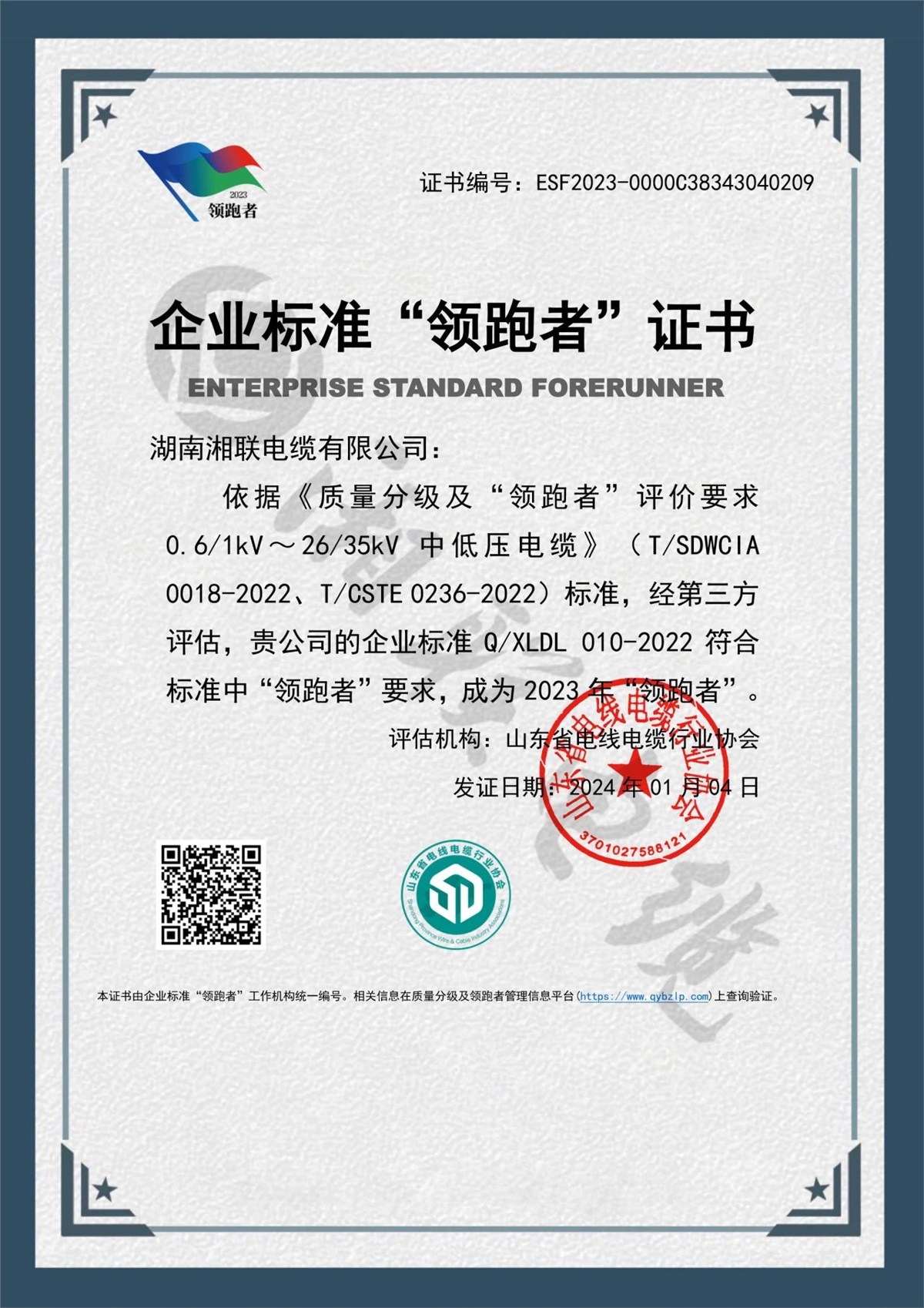 1月,企業(yè)標(biāo)準(zhǔn)領(lǐng)跑者管理信息平臺(tái)公布了2023年企業(yè)標(biāo)準(zhǔn)領(lǐng)跑者名單,湖南湘聯(lián)電纜有限公司憑借企業(yè)標(biāo)準(zhǔn)Q/XLDL 010-2022,成為2023年企業(yè)標(biāo)準(zhǔn)“領(lǐng)跑者”,湘聯(lián)電纜連續(xù)三年獲此殊榮。