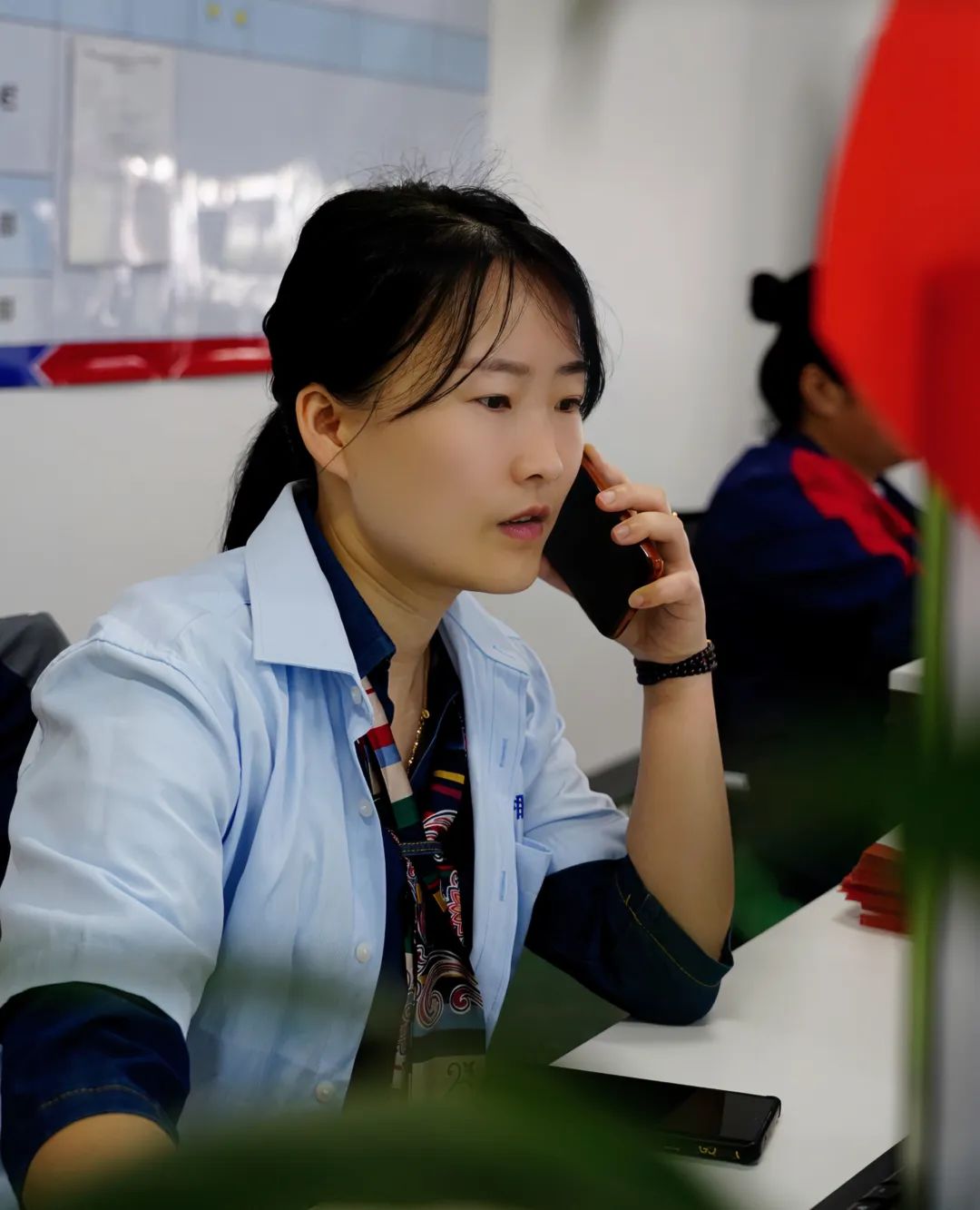 ▲楊祁矞正在與同事協(xié)商解決客戶問(wèn)題